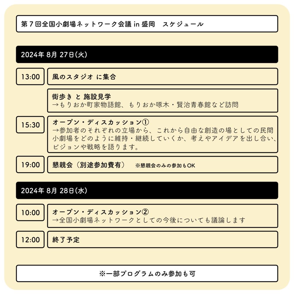 今回の会場「風のスタジオ」を運営する NPO法人いわてアートサポートセンターは、地域の公立文化施設の運営業務と並行して民間小劇場を維持しているのが特長です。今回は、市内文化施設巡りの街歩きを交えつつ、これからの時代どのように自由な創造の場を確保していくのか、学び、ともに考え、交流したいと思います。